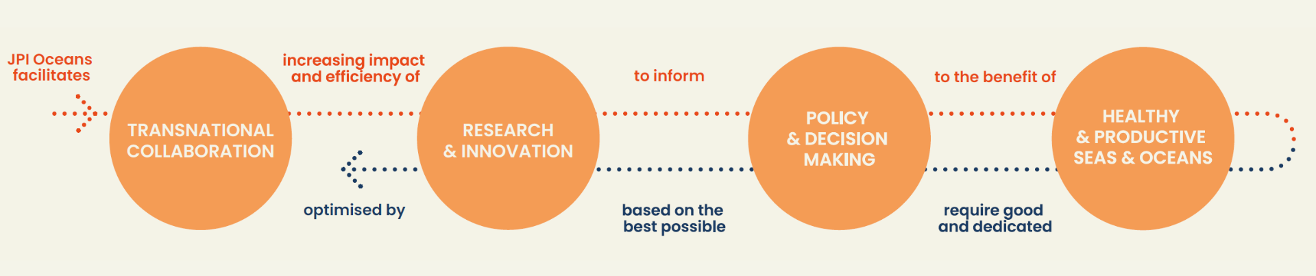 JPI Oceans prioritises, structures, and funds international research and innovation for sustainably healthy and productive seas and oceans. First, we align priorities by engaging member countries in sharing national priorities, identifying emerging topics, and participating in transnational science-policy processes at regional, European, and global levels. Secondly, we implement collaborative research and innovation that maximises resource efficiency and impact, whilst maintaining flexibility to respond rapidly to new opportunities and collaborations. Third, we impact decision-making by ensuring research and innovation outcomes contribute to transformative policy towards healthy seas and oceans and a sustainable ocean economy by facilitating knowledge transfer and increasing ocean literacy among key sectors of politics and society. Our distinctive strength lies in our capacity to act as a first mover on emerging topics, orchestrating coordinated research and innovation where knowledge gaps exist, and structuring unwieldy knowledge into actionable scientific guidance for policy.