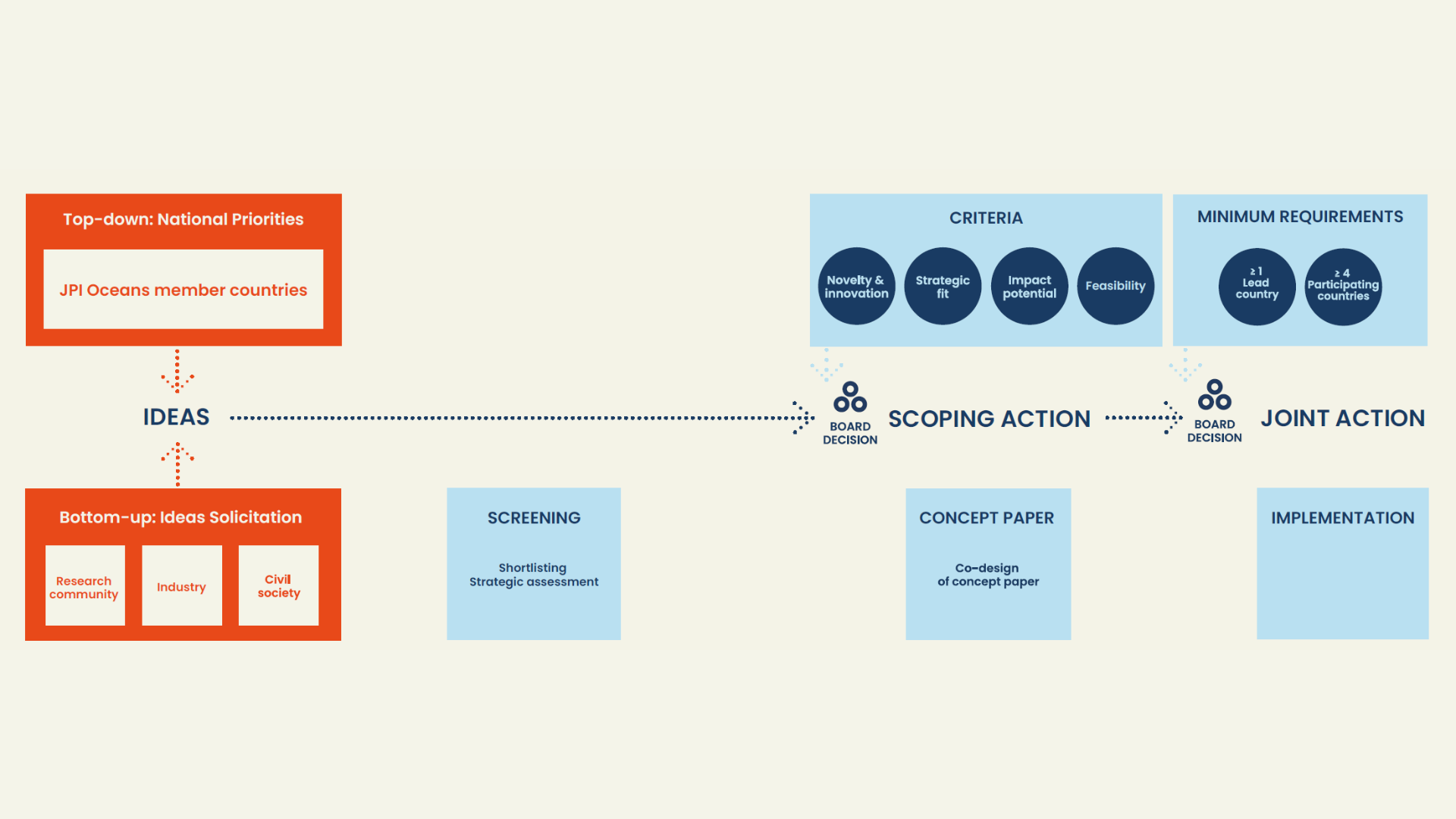 JPI Oceans operates through an agile and flexible approach that maximises resource efficiency and impact. Our implementation is built on variable geometry, allowing member countries to participate in Joint Actions based on their specific priorities and capacities, with a minimum of four countries ensuring critical mass for meaningful collaboration. Through diverse implementation tools—including Joint Calls, Knowledge Hubs, and infrastructure sharing—we facilitate collaborative research and innovation that addresses shared challenges across European sea basins and beyond. Co-design is central to our approach: we align national priorities, solicit ideas from the research community and stakeholders, and develop activities through close collaboration between participating countries, scientific experts, and policy makers. This ensures our activities remain focused on delivering tangible impacts whilst maintaining scientific excellence, feeding expert knowledge effectively into policy processes to support informed decision-making at national, European, and international levels.
